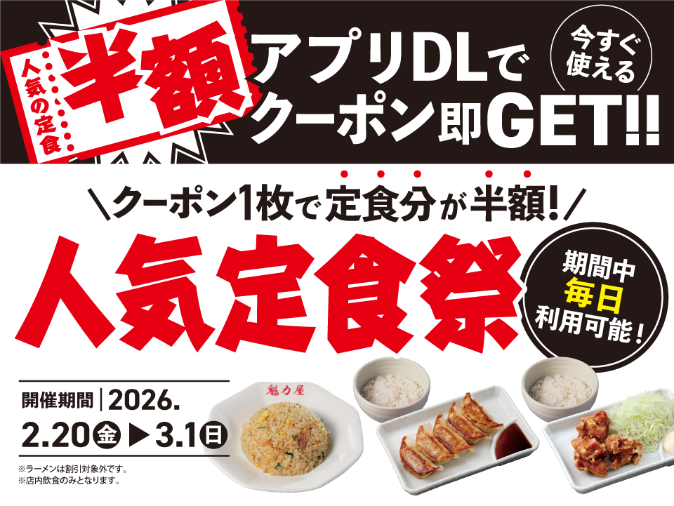 2月20日(金)~3月1日(日)の10日間限定で、「人気定食祭」を初開催! 期間中、ラーメン魁力屋公式アプリに届くクーポンをご提示いただくと、対象の人気定食3種の定食分が半額でお召し上がりいただけます。 ※ラーメンは通常価格となります。 しかも!このクーポンは上記期間中毎日利用可能! 毎日、焼きめし定食を楽しむもよし! 日替わりで餃子・唐揚げ・焼きめし定食をローテーションするもよし! 複数定食をおひとりで、ご友人やご家族といろんな定食をシェア…などなど楽しみ方は自由自在! 初開催のこのチャンス、見逃す手はありません。 10日間、定食を楽しみ尽くし、魁力屋で元気をチャージしてください!