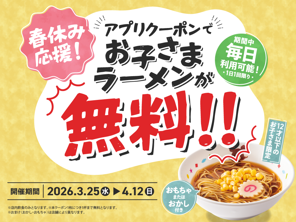 2026年3月25日(水)~2026年4月12日(日)の期間中、アプリ会員様限定で「お子さまラーメン」が無料になるクーポンを配布いたします。 ママ・パパも、お子さまも、1年間お疲れさまでした。 進級、進学前の、ちょっと特別な春休みに家族そろって魁力屋へ。 上記期間中、アプリ会員様限定で「お子さまラーメン」が無料になるクーポンを配布いたします。(※ご使用はラーメン(並)または(大)を1杯以上ご注文いただいた方に限る) さらに、お子さまラーメンは、おもちゃまたはおかし付き! しかもこのクーポン、公式アプリをダウンロードすると、クーポンは即日取得でき、期間中は毎日ご利用いただけます( ※1日1回限り)。 新年度を前に、ご家族そろって魁力屋でゆったりとしたひとときをお過ごしください。